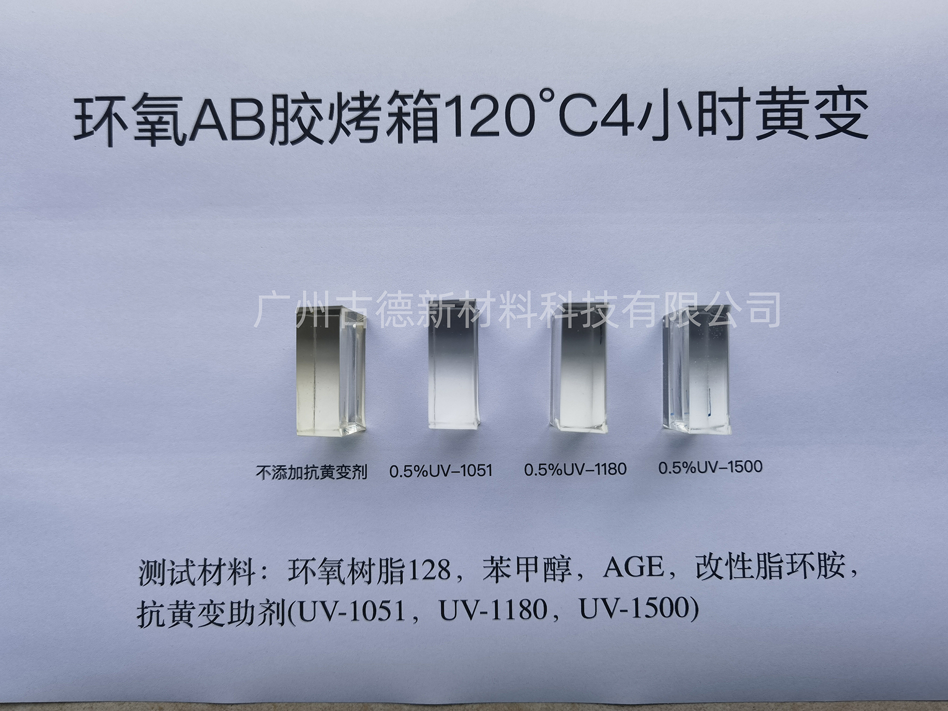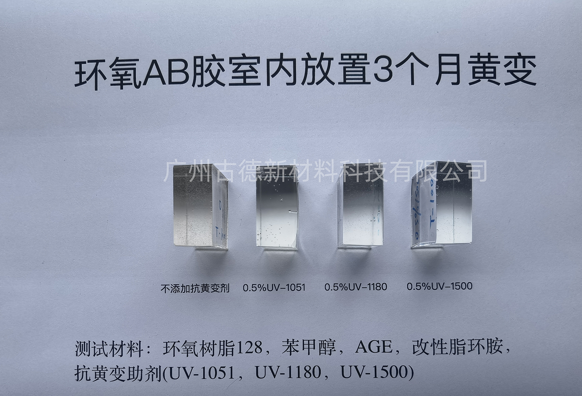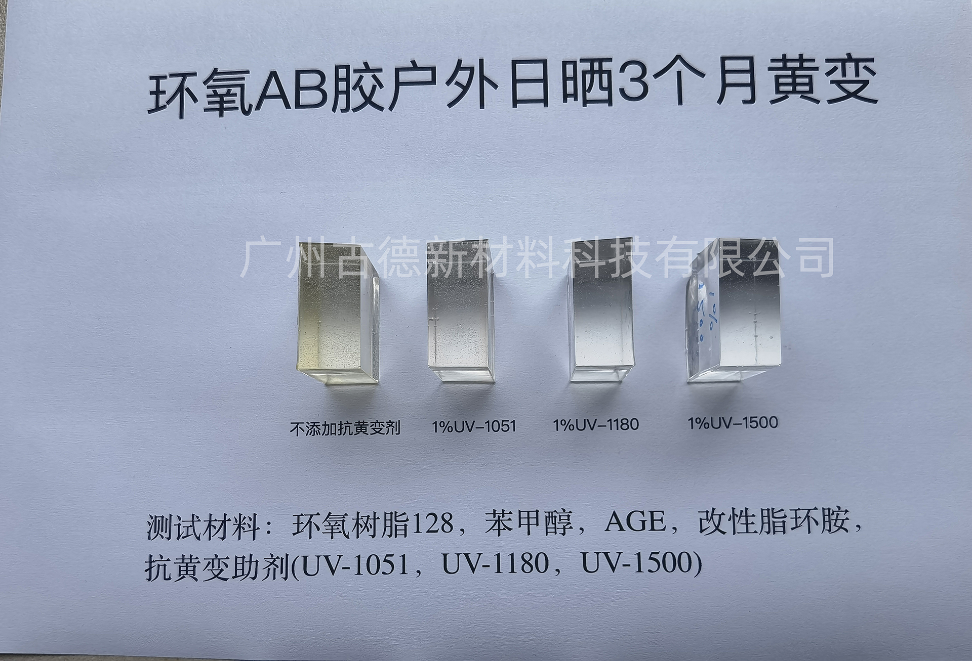 本文對古德新材料的UV-1051、UV-1180、UV-1500三款抗黃變助劑進行環氧體系的黃變測試,分常溫室內放置、烤箱高溫、戶外日曬三個場景進行對比。