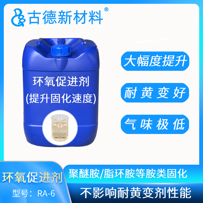 RA-6是一款高性能改性胺環氧促進劑,添加適量本促進劑,在環氧活性較低的配方中能大幅提升環氧樹脂的反應速度,對比常見的叔胺類促進劑(K54/DMP-30),RA-6有良好的耐黃變性,低氣味且低堿性,與抗黃變劑等相容性良好,不影響配方中抗黃變劑的性能表現。